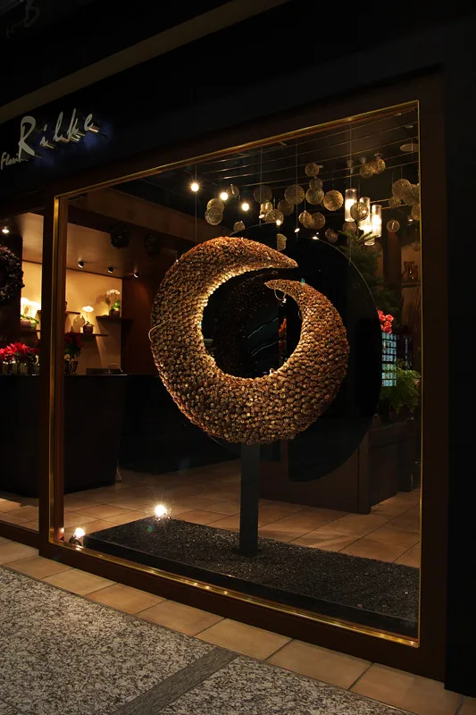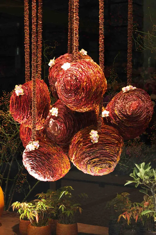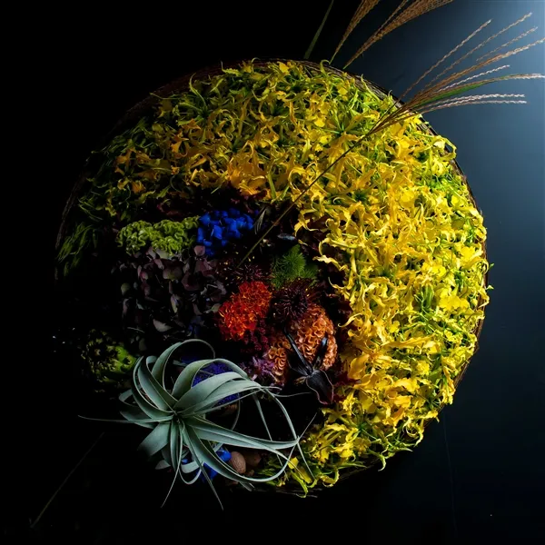 今、気に入っている花材は、圧倒的な存在感のビジュアルと 黒が与える緊張感が高貴なブラックダリア「黒蝶」や、 武骨なフォルムとパンキッシュなルックス、シルバーカラーがクールで都会的な ティランジア「イキシオイデス」など。 こうした花のキャラクターを引き出しながら、自由で遊び心のあるデザインや ストーリー性のあるディスプレイに仕上げていくのが僕のやり方です。 作品としては、傷ついた花、枯れている花、捨てられる花、壊れた器、 捨てられる物などで、花の本質を表現してみたい。 常に不満足であることにこだわりながら、 これからも仕事を楽しんでいきたいと思います。